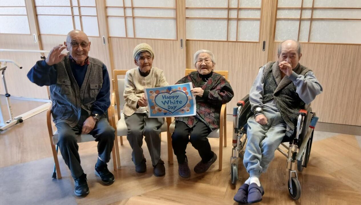 3月14日のホワイトデーにはお昼には海鮮ちらしを、おやつにはチョコレートロールケーキをお出ししました。海鮮がお好きな方が多く、お寿司や海鮮ちらしなどをお出しすると皆様とても喜ばれます。「お~!今日は海鮮ちらしなのね。嬉しい!」「今日は豪華だな」などの声が聞かれました。チョコレートロールケーキも「もう1つちょうだいよ」「美味しい!」など大好評でした。美味しく食べれるというのは何よりも幸せなことですね。