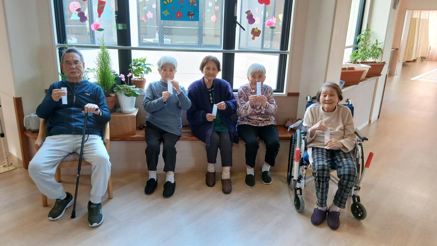 お正月は楽しく過ごされましたでしょうか。なのはな館みさきではご入所者様におみくじを引いたり、絵馬を書いていただきました。「今年も頑張るぞ!」「おやつが沢山届きますように」「健康」などいろいろな願いがありました。