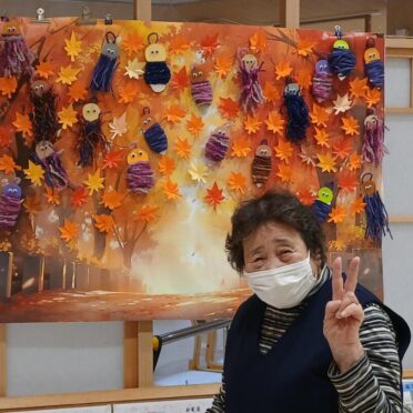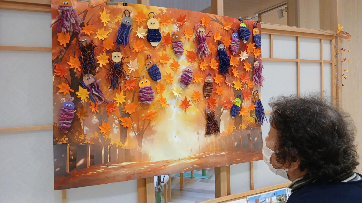 ご利用者様と一緒に作った紅葉の葉っぱとミノムシを玄関ホールに飾りました。なのはな館にお越しの際はぜひ、ご覧ください。