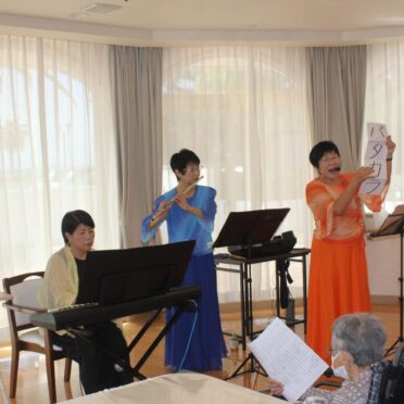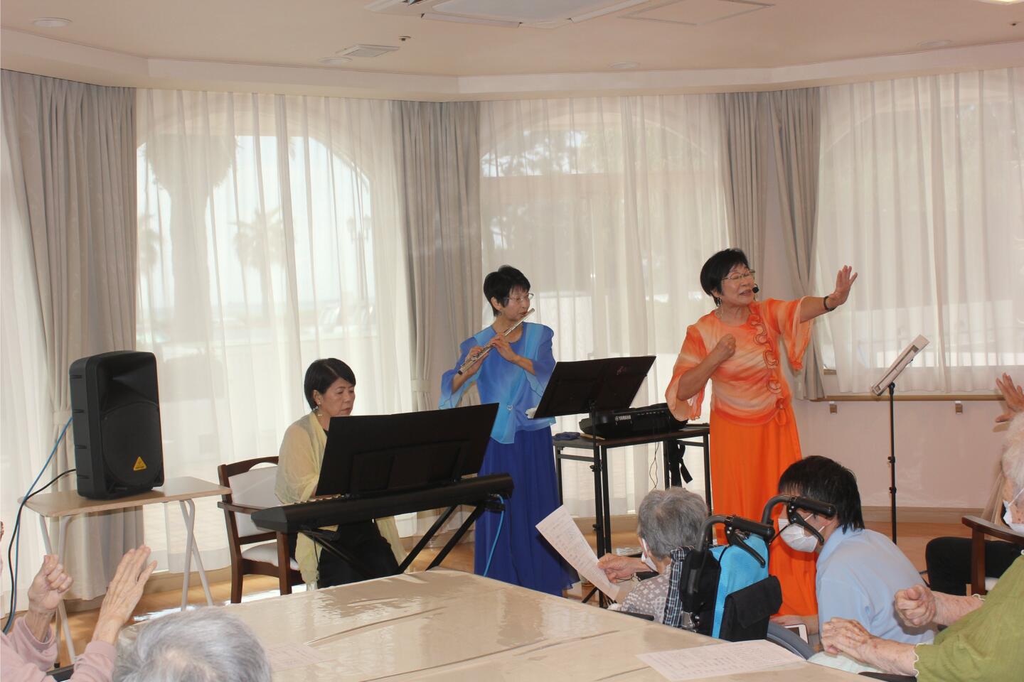 サウンドセラピー「くさぶえ」の皆様になぎさにもお越しいただきコンサートを開催しました。今回は、秋を感じられる童謡の他にも、村祭りや真っ赤な太陽など楽しい曲も演奏いただきました。最後の曲が終わると「アンコール!アンコール!」と皆様で手拍子でリクエストしました。音楽体操は、気分を高め、ストレスが軽減するだけでなく認知機能の向上にもつながると言われています。美しい音色に心を癒され、明るい音楽で楽しく体操。歌って、踊って充実した時間を過ごすことができました。また、ぜひお越しください。お待ちしております。